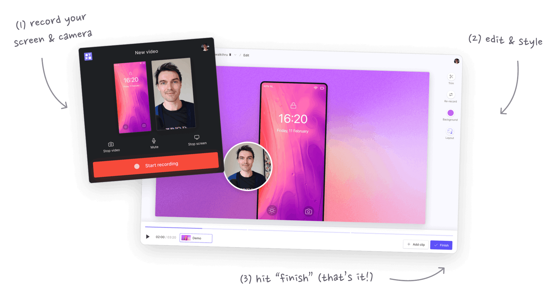 Once you’ve recorded your clips you can customise and edit them. Trim clips so that they start and end where you want. Choose custom backgrounds and layouts that work best with the mobile screen size.