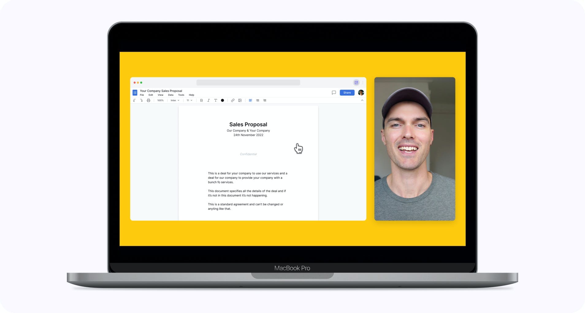 A proposal walkthru video is a presentation, usually done by a sales associate or founder, that outlines how an agreement or contract. Rather than sending over a lengthy email with your proposition, a video where you walk your prospect through what you offer is more engaging and may potentially be the deciding factor in whether or not they go with you.